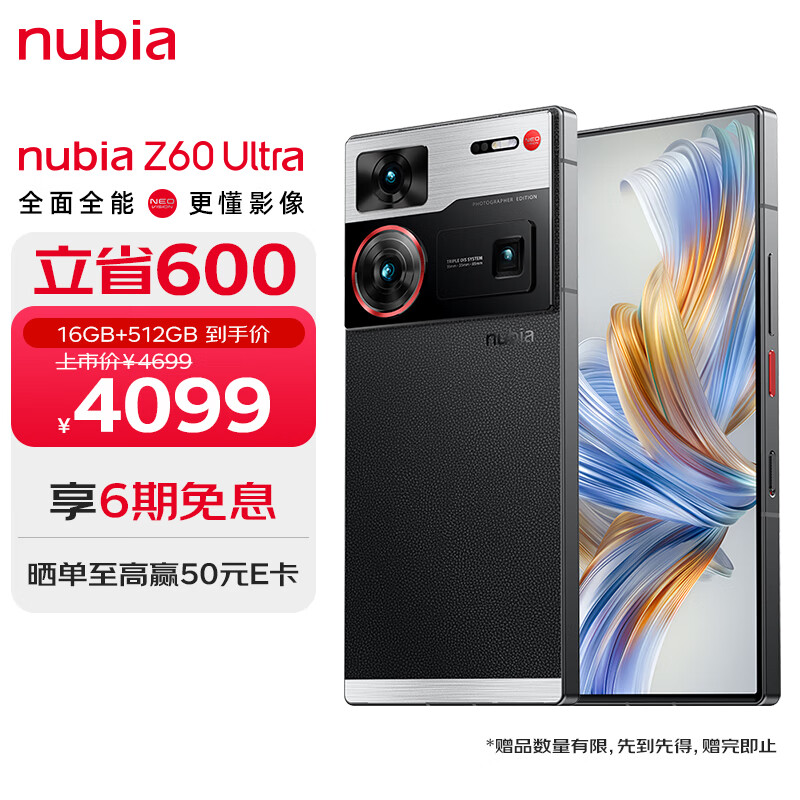 nubia努比亚Z60Ultra屏下摄像16GB+512GB摄影师版 第三代骁龙8 三主摄OIS+6000mAh 5G中兴手机游戏拍照价格:4098.00元!