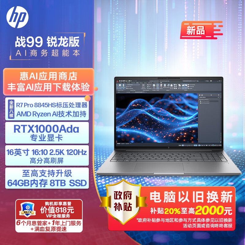 惠普(HP)战99 24款锐龙高性能笔记本AI电脑工作站16英寸R7 Pro-8845HS 32G 1T RTX1000Ada 2.5K屏 三年上门价格:10999.00元!