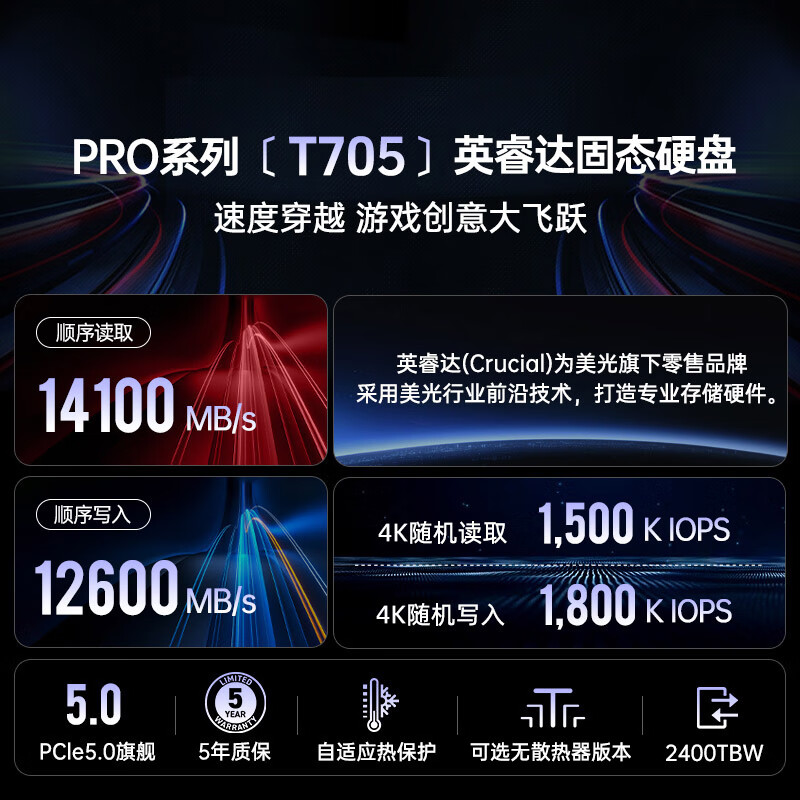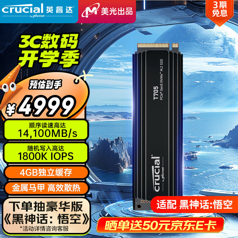 Crucial英睿达 美光4TB SSD固态硬盘 M.2接口(NVMe PCIe5.0*4)读速14100MB/s T705散热版 适配黑神话悟空价格:4999.00元!