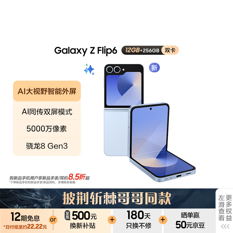 三星(SAMSUNG)Galaxy Z Flip6 AI手机 大视野智能外屏 5000万像素 骁龙8 Gen3 双卡 折叠屏 12GB+256GB 夏沫蓝价格:7999.00元!