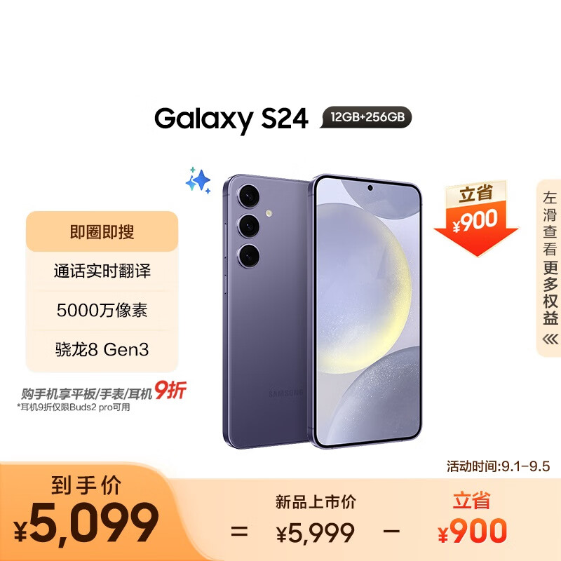 三星(SAMSUNG)Galaxy S24 AI手机 超视觉影像 5000万像素 拍照手机 第三代骁龙8 游戏手机 12GB+256GB 秘矿紫价格:5099.00元!