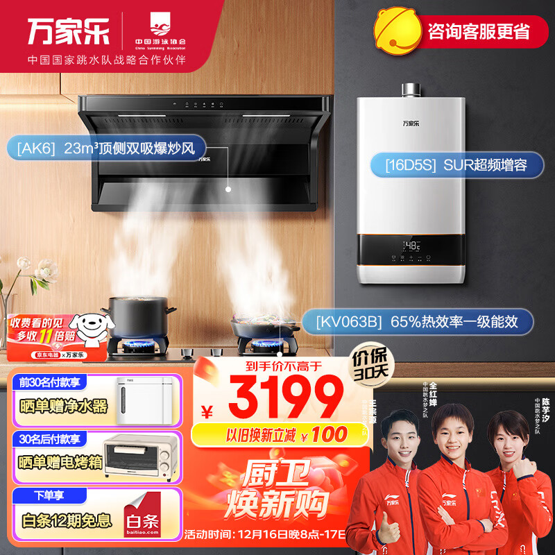 万家乐烟灶热三件套 23立方顶侧双吸油烟机16L四季随温感热水器多件套装AK6+KV063B+16D5S天然气价格:3499.00元!