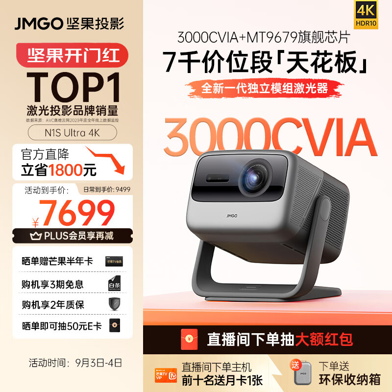 坚果投影N1S Ultra 4K超高清纯三色激光 云台投影仪家用电视家庭影院(MT9679旗舰芯片 新一代定制激光器)价格:7699.00元!