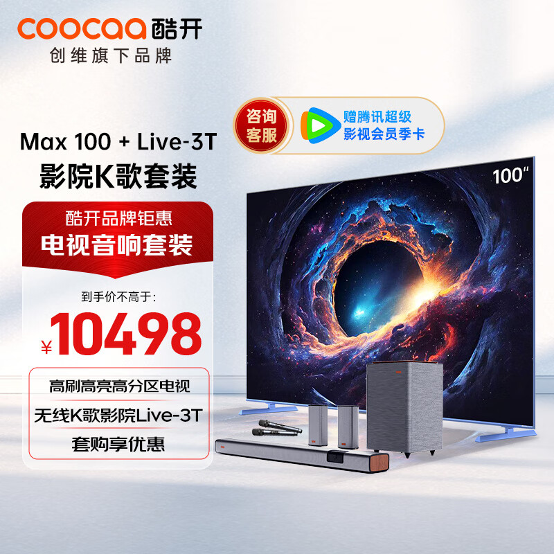 酷开创维Max100 100英寸电视 高刷高亮高分区电视机+无线K歌影院Live-3T 家庭KTV环绕音响 回音壁套装价格:10498.00元!