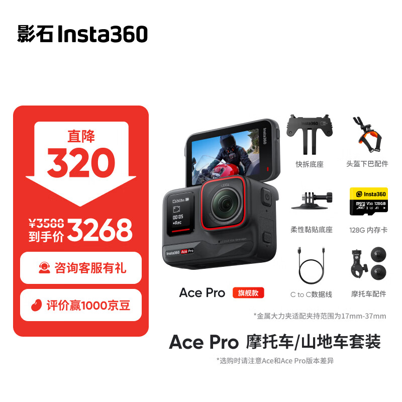 Insta360影石 Ace Pro运动相机AI智能摄像机防抖摩托(摩托车/山地车套装)价格:3268.00元!