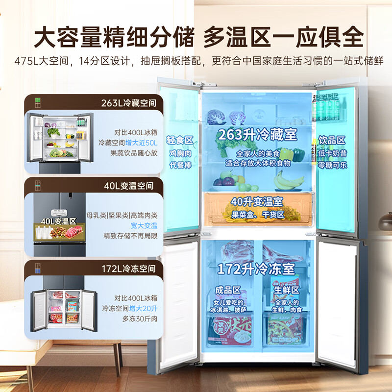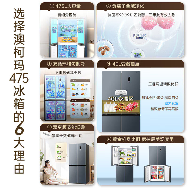 澳柯玛(AUCMA)475升十字双开四开多门风冷无霜家用大容量一级能效双变频超薄电冰箱 以旧换新BCD-475WPHXFE价格:1799.00元!
