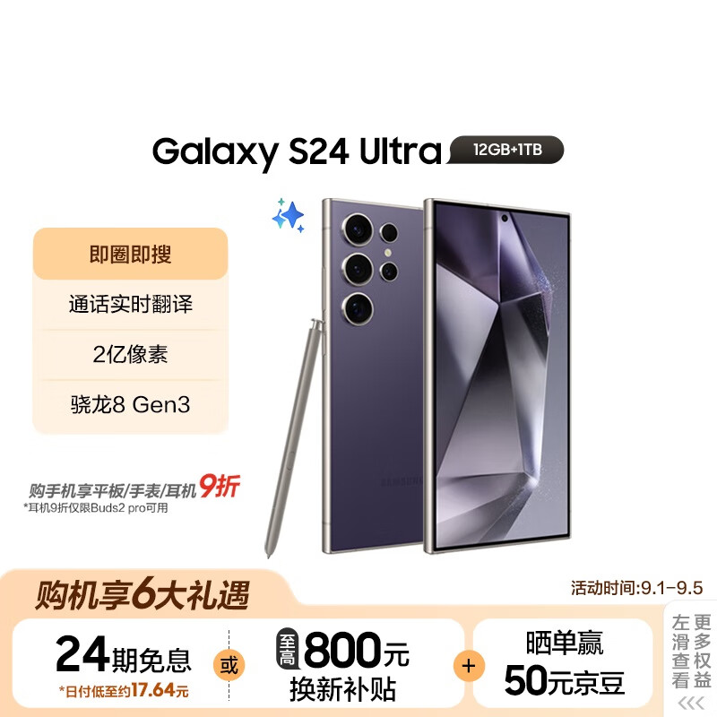 三星(SAMSUNG)Galaxy S24 Ultra AI手机 第三代骁龙8 游戏手机 2亿像素 拍照手机 钛金属边框 12GB+1TB 钛暮紫价格:12699.00元!