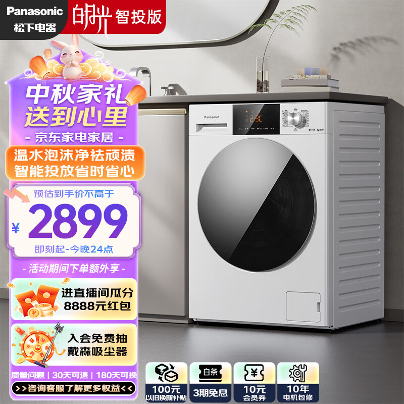 松下(Panasonic)滚筒洗衣机全自动 超薄全嵌【白月光智投版】10公斤 温水泡沫净 户外服洗 智能投放 XQG100-810F价格:2899.00元!