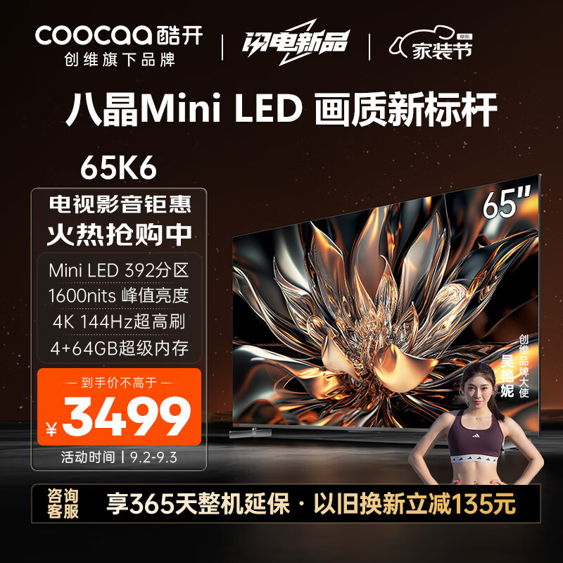 酷开创维65K6 65英寸 Mini LED 1600nits 392分区 4K 144Hz 哈曼调音 一级能效液晶游戏电视机65P6E价格:3499.00元!