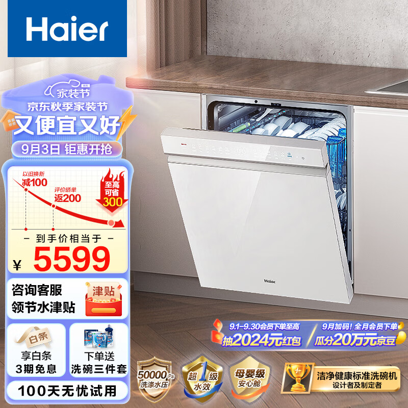 海尔(Haier)15套嵌入式双面洗健康洗碗机云溪W5000S 变频高压双一级水效 三重洁净智能开门速干EYBW152266WEU1价格:5899.00元!