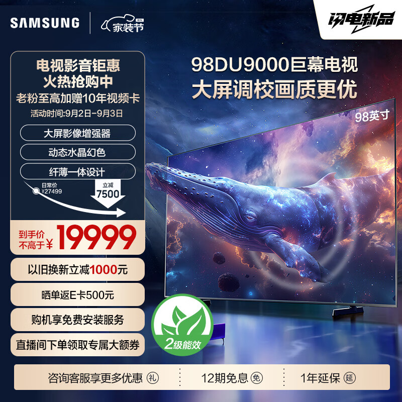 三星(SAMSUNG)98DU9000 98英寸 AI电视 超薄4K 无开机广告 大屏影院 UA98DU9000JXXZ 北京以旧换新2级能效价格:19999.00元!