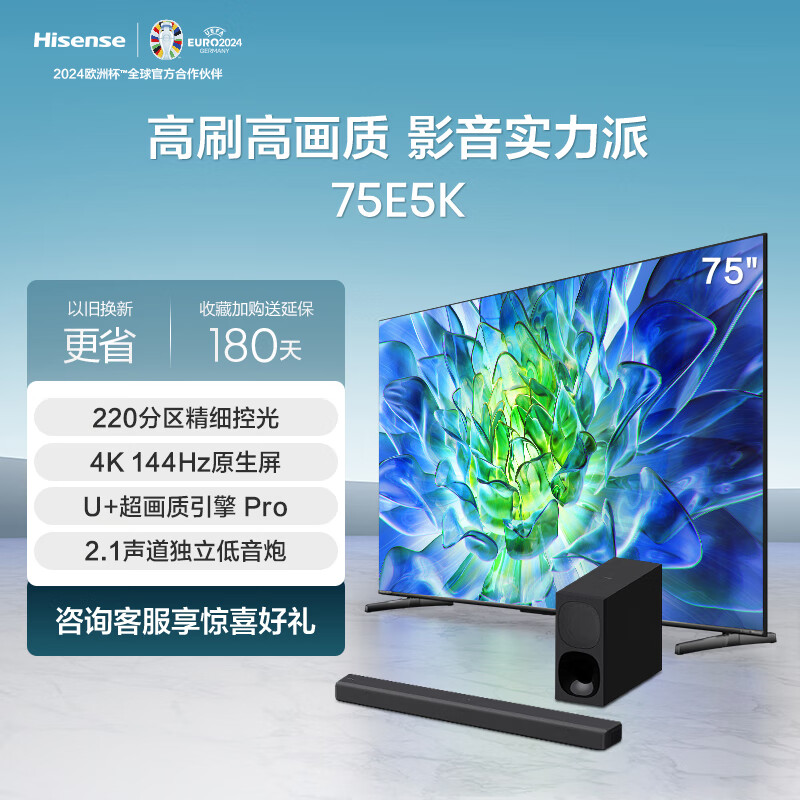 海信电视75E5K+HT-G700沉浸追剧套装 75英寸 ULED 4+64GB 4K 144Hz超高清智慧屏电视机价格:6039.00元!