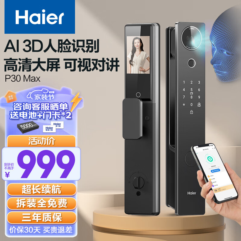 海尔(Haier)智能门锁人脸识别电子锁密码门锁入户门防盗门家用指纹锁P30Max价格:1299.00元!
