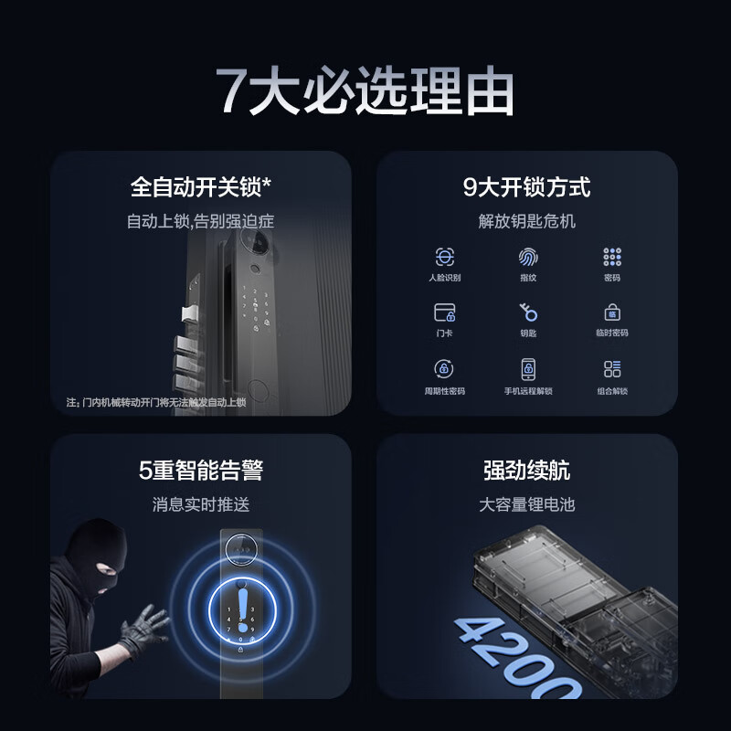 附加功能:防小黑盒,试错报警,徘徊抓拍,静音模式,虚位密码,防试开报警,防撬报警,防劫持报警,电池更换提醒,可视对讲