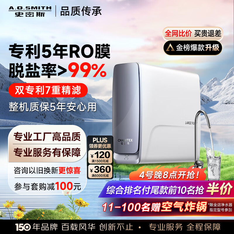 史密斯(A.O.SMITH)佳尼特蓝鲸净水器家用厨下式直饮净水机2.5升/分钟专利MAX5.0反渗透 0陈水 CR2500AB1 以旧换新价格:3598.00元!