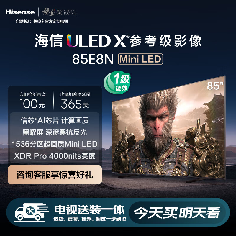 海信电视85E8N【送装一体版】85英寸 ULED X 1536分区Mini LED 4000nits 液晶平板游戏电视机价格:8999.00元!