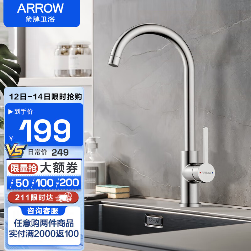 箭牌(ARROW)304不锈钢水龙头冷热厨房水槽防溅洗菜盆龙头 银色 不锈钢冷热 厨房龙头价格:248.75元!