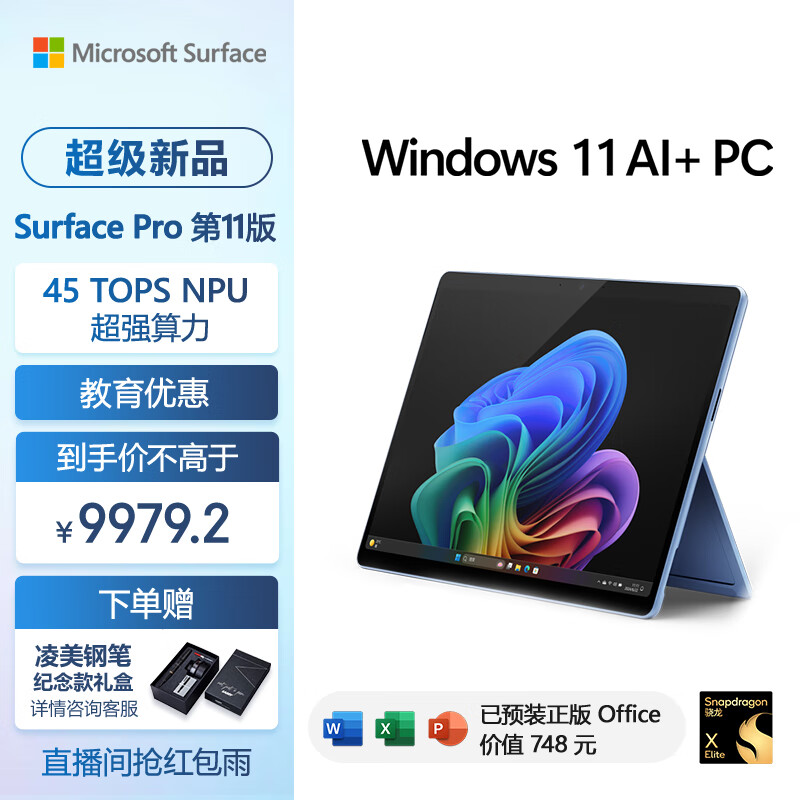 微软(Microsoft)全新Surface Pro第11版 骁龙X Elite 16G 512G宝石蓝二合一平板笔记本电脑 AIPC Pro 11教育优惠价格:9979.20元!