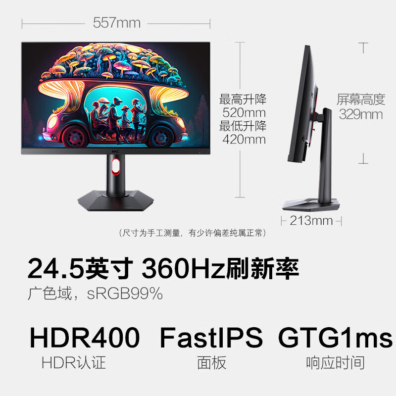 HKC 24.5英寸360Hz高刷FastIPS快速液晶HDR400旋转升降电竞游戏屏GTG1ms适用PS5电脑显示器神盾MG25H价格:2299.00元!