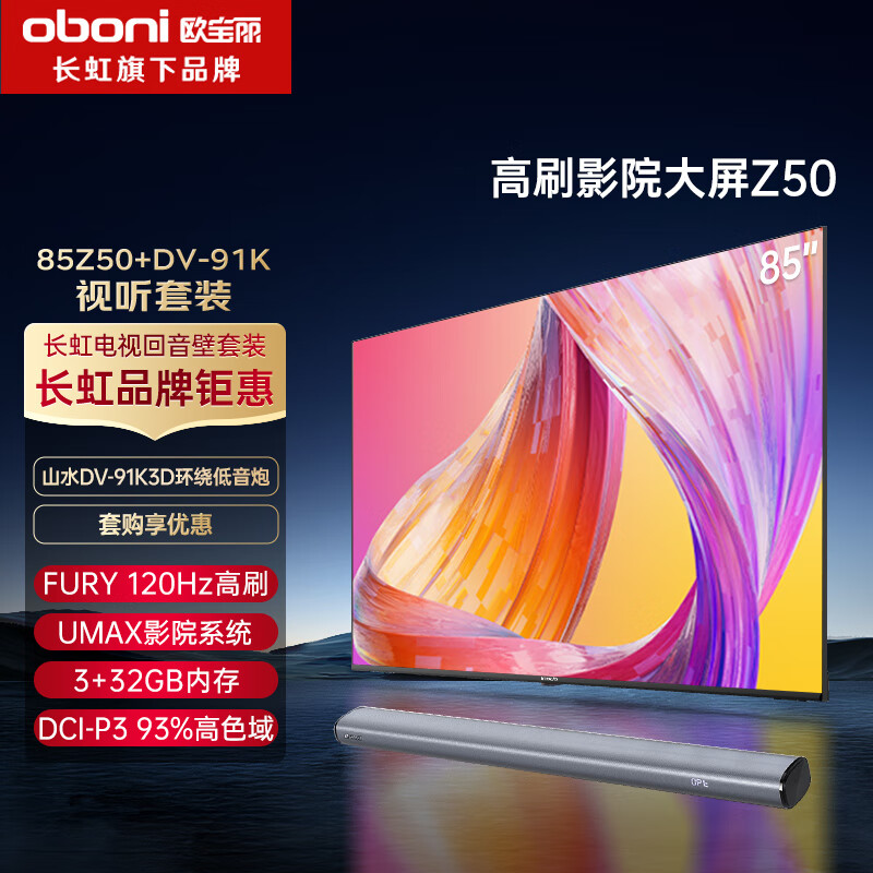 长虹欧宝丽85Z50 85英寸4K超清120Hz高刷影音大屏电视+山水DV-91K3D环绕低音炮价格:5898.00元!