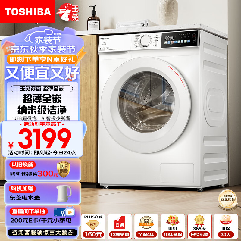 东芝(TOSHIBA)滚筒洗衣机全自动家用【玉兔DG-10T13BF】超薄全嵌 10公斤大容量智能投放 BLDC变频电机 以旧换新价格:3199.00元!