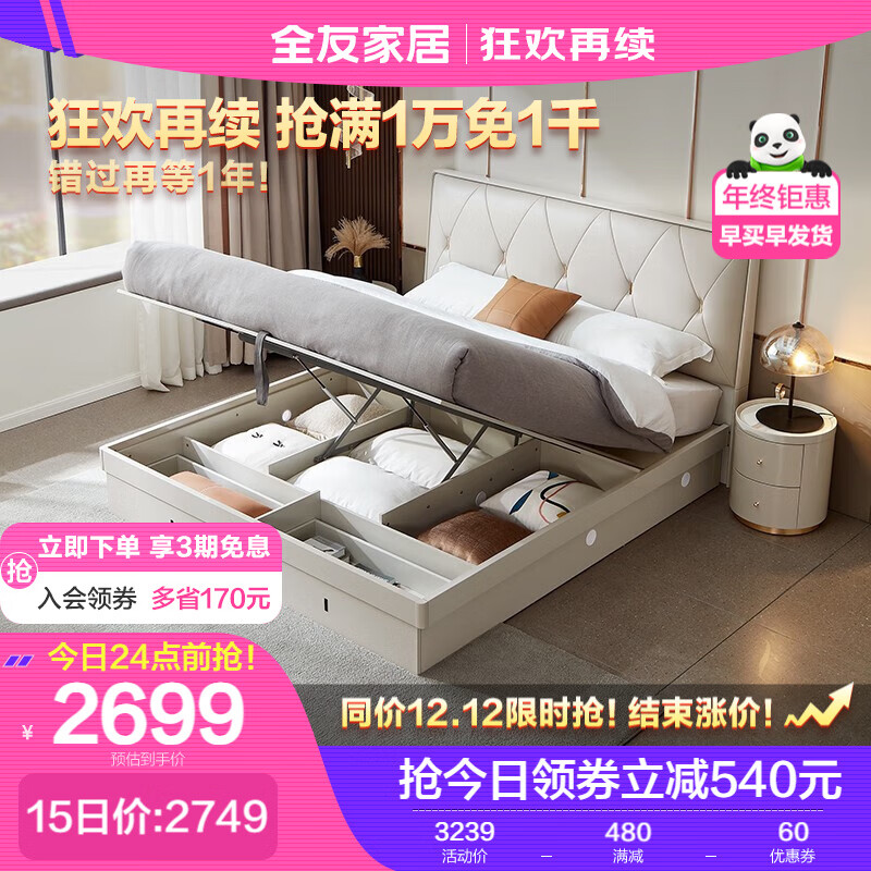 全友家居 床 轻奢欧皮软床主卧实木床屏边框高箱储物床127801 1.8米带抽高箱床+127801床头柜*1价格:3239.00元!