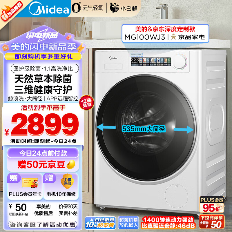 美的(Midea)滚筒洗衣机全自动家用 小白鲸MG100WJ3 10公斤超薄 元气轻氧 草本除菌 超薄全嵌 1.1洗净比 鲸浪洗价格:2899.00元!