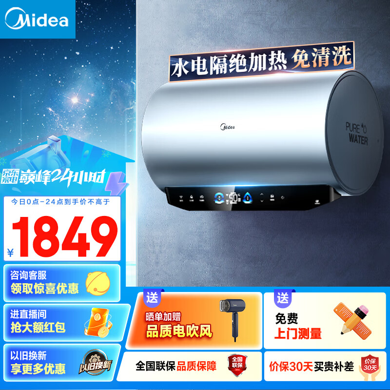 美的(Midea)水电分离80升电热水器家用 3300W变频5G速热 10重过滤净肤瓷净舱内胆免清洗以旧换新F8033-PE8(HE)价格:2049.00元!