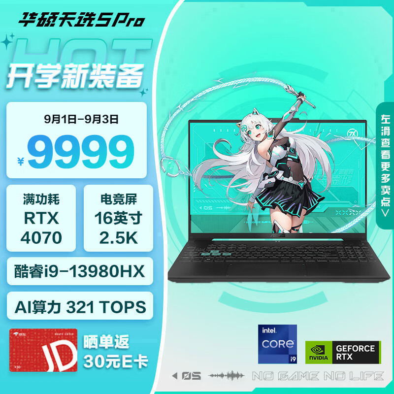 华硕天选5 Pro 24核酷睿i9 16英寸游戏本 笔记本电脑 畅玩黑悟空(i9-13980HX 16G 1T RTX4070 2.5K)灰价格:9999.00元!