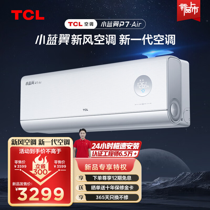 TCL新风空调1.5匹新一级变频冷暖语音30m3/h大新风量小蓝翼P7挂式空调挂机KFR-35GW/YP7Cb+B1价格:3299.00元!