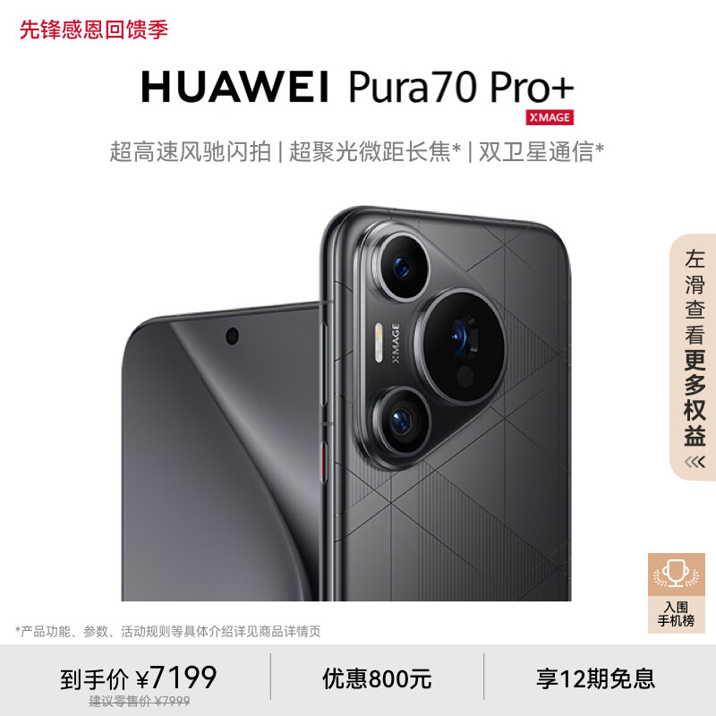 HUAWEI Pura 70 Pro+ 魅影黑 16GB+512GB 超高速风驰闪拍 超聚光微距长焦 双卫星通信 华为P70智能手机价格:7199.00元!