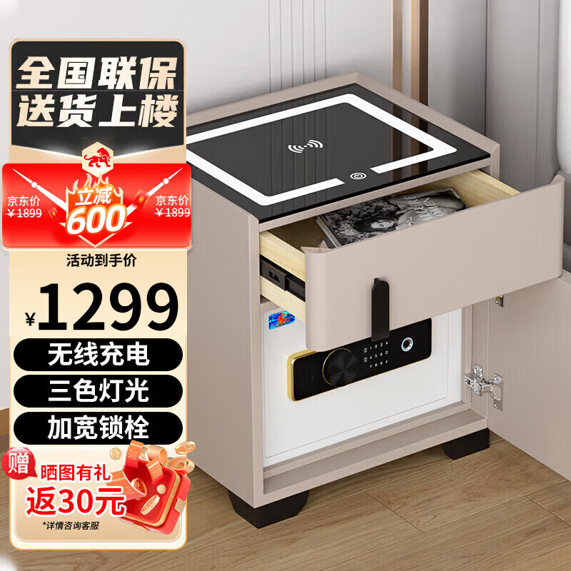 虎牌保险柜家用智能床头柜保管柜指纹密码抽屉柜智能隐形现代简约夹万无线充电保险箱北曦53cm卡其色价格:1549.00元!
