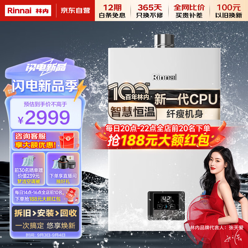林内(Rinnai)【小蛮腰】16升燃气热水器 智慧恒温 全新升级CPU 黄金窄比 RUS-16GD31(JSQ31-GD31)以旧换新价格:2999.00元!