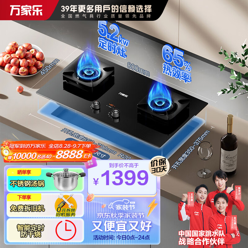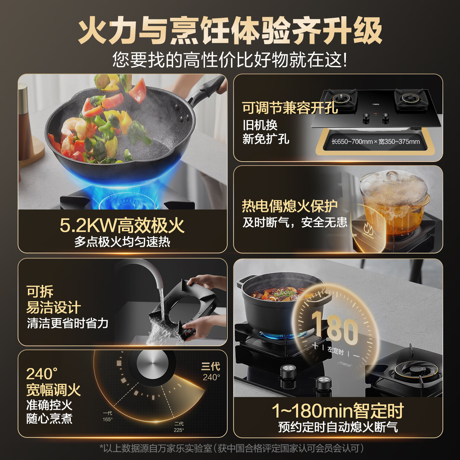万家乐燃气灶天然气灶5.2kW猛火灶 家用智能防干烧定时三防灶台嵌两用全进风铜火盖可拆炉头灶具JZT-AC7A价格:1499.00元!