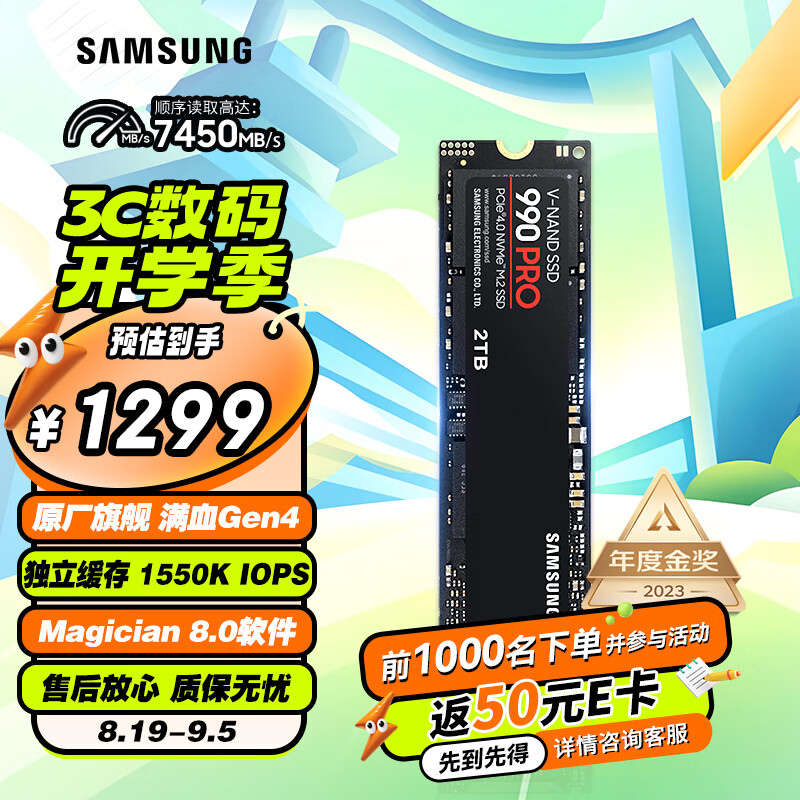 三星(SAMSUNG)2TB SSD固态硬盘 M.2接口(NVMe协议PCIe 4.0 x4) AI电脑配件 读速7450MB/S 990 PRO价格:1299.00元!