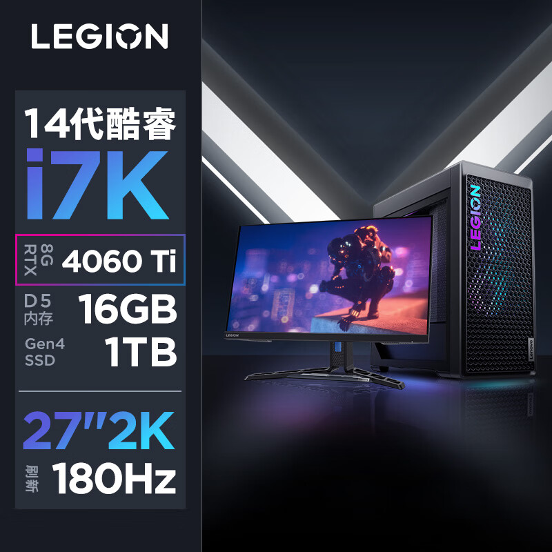 联想(Lenovo)拯救者刃7000K 2024游戏电脑主机(酷睿14代i7-14700KF RTX4060Ti 8GB显卡 16G 1T SSD)27英寸套装价格:11199.00元!