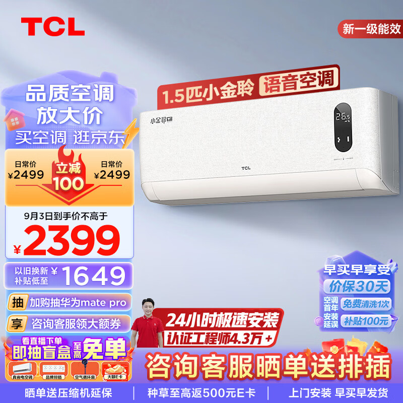 TCL空调1.5匹新一级能效变频冷暖 小金聆T7G 智慧语音 卧室壁挂式空调挂机KFR-35GW/RT7Ga+B1以旧换新价格:2399.00元!