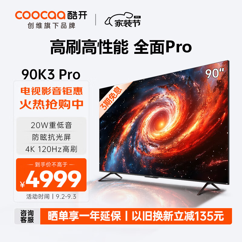 酷开创维K3 Pro 90英寸电视 4K120Hz高刷 3+64GB 85英寸+ 投屏液晶平板游戏电视机以旧换新90P3D Max价格:4999.00元!