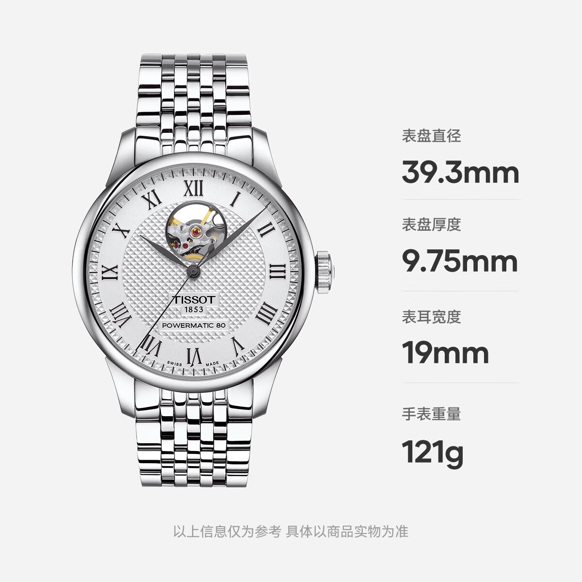 4、外形外观:很喜欢这款表,本来想买白盘,结果没货,就买了银盘。表带材质:钢带。机芯类型:80机芯精准程度:目前戴了一个月,快了1分20秒左右,还算可以吧,毕竟是几千的机械表,要求不要那么高。防水性能:日常溅水吧,其它的也不敢尝试呀。其他特色:京东快递,很快哦,早上下单,下午就到了。