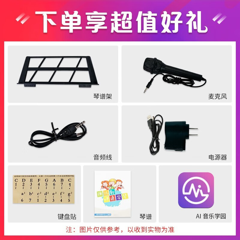 4、声音标准,清澈。音效超多,自学够用。琴架高度可调,附带按键贴,对自学者熟悉键盘很有用处,价格合适,性价比高,希望孩子常练,不要吃灰。