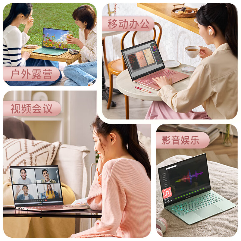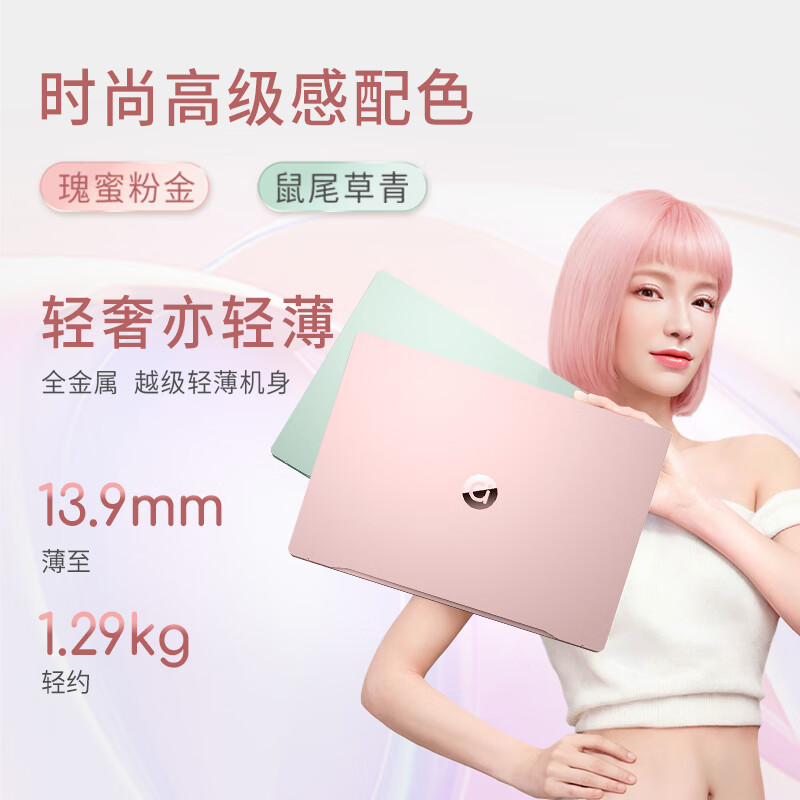 3、轻薄高颜值、多彩配色这款笔记本真的非常轻薄,重量大约1.29kg,厚度仅有13.9mm它的配色也十分青春靓丽,我这款是鼠尾草青是巴胺配色,非常吸引人。表面采用了这种混成喷砂技术可以有效避免沾染指纹,质呈现出时尚、精致的一面。