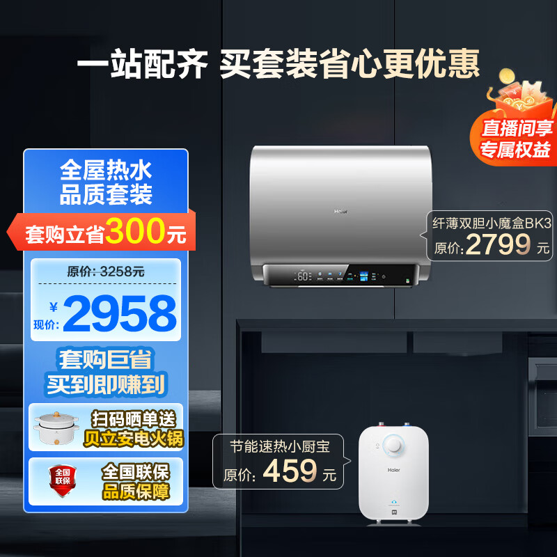 海尔(Haier)超薄扁桶双胆60升家用电热水器3300W变频速热小魔盒镁棒免更换WIFI智控EC6003-BK3KU1【全屋热水】价格:2958.00元!