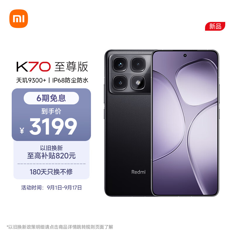 小米(MI)Redmi K70 版 天玑9300+ IP68 小米龙晶玻璃 16GB+512GB 墨羽黑 小米红米K70 Ultra 5G手机价格:3199.00元!
