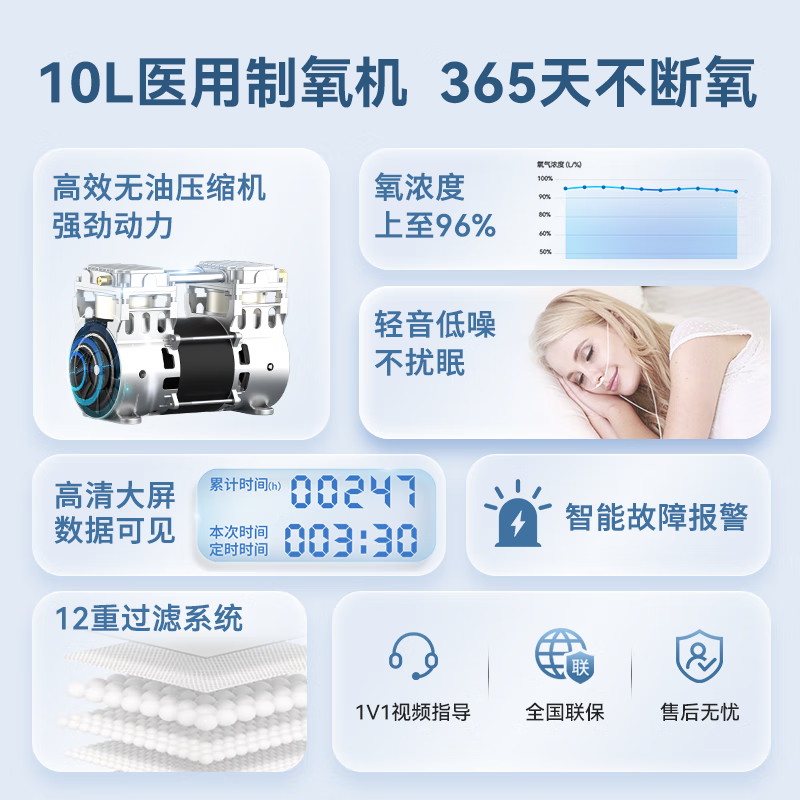 1、制氧机一收到就用上了,感觉氧气流很大,很稳定,整个机器功能运转正常,不愧是老品牌,质量还是很不错的,家人有慢性基础病,所以会每天坚持用很不错的制氧机