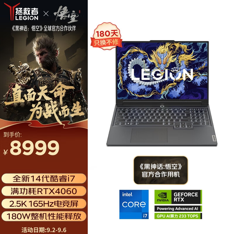 联想(Lenovo)畅玩 黑神话悟空官方合作 拯救者Y7000P 游戏笔记本电脑 14代i7-14700HX 16G 1T RTX4060 2.5K屏价格:8999.00元!