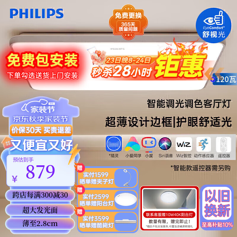 飞利浦led吸顶灯智能客厅灯现代简约超薄灯具灯饰智控调光120W 怡轩价格:969.00元!
