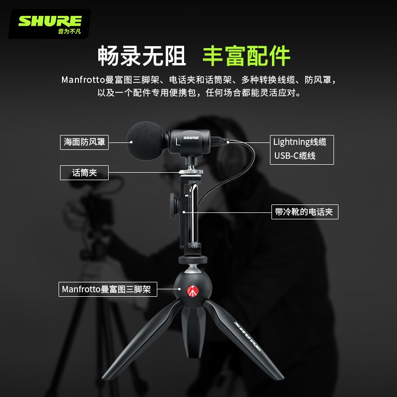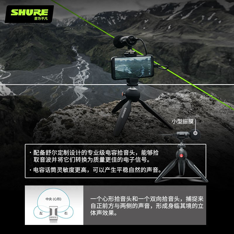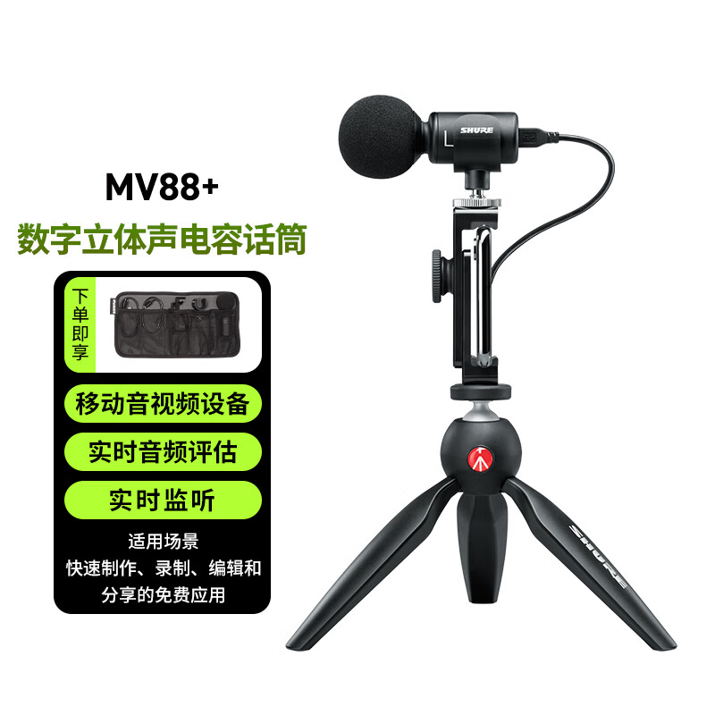 SHURE舒尔MV88+ 数字立体声电容话筒 Vlog指向性收音迷你采访K歌唱歌录音便携式户外直播采访麦克风价格:1988.00元!