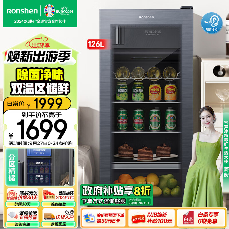容声(Ronshen) 126升小冰吧客厅办公室一级能效家用饮料水果蔬菜冷藏冰箱除菌净味玻璃门冷柜JC-126RSY以旧换新价格:1699.00元!