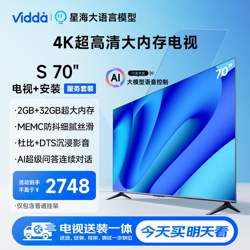 Vidda S70【送装一体版】海信 70英寸 超薄屏 电视服务套装 送货 安装 挂架 调试一步到位价格:2748.00元!