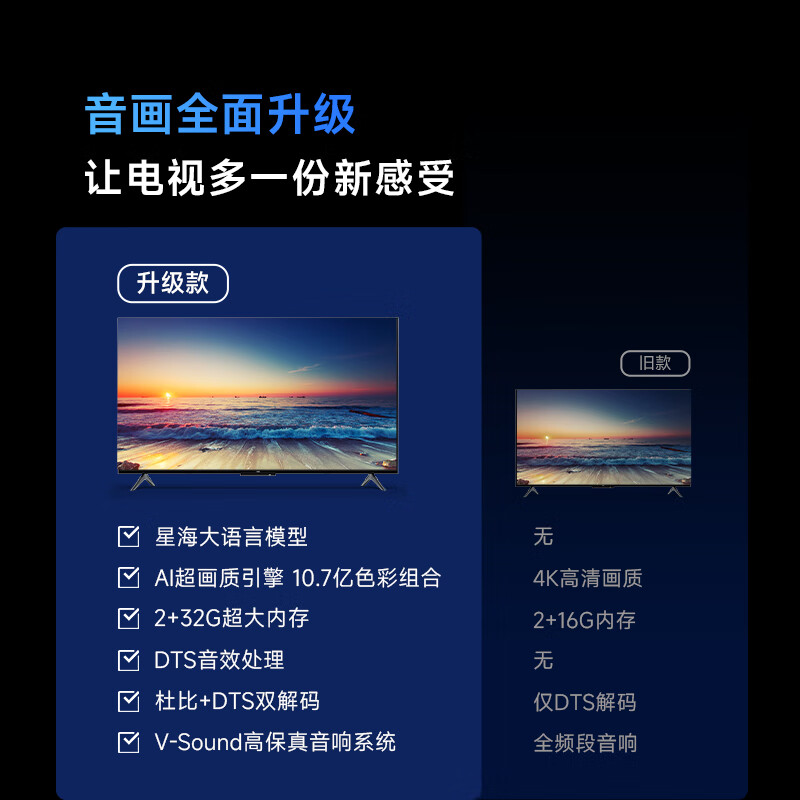 2、对比了很多品牌,选择了这款海信的子品牌,内存32也基本能满足下载APP了,相等内存的,价格还要贵,这款性价比算高了,尺寸刚好合适我家电视柜,画面看着舒服,这个价位可以用苹果手机镜像投屏不错,唤醒功能也挺好用的,很满意的大件购物体验,预算有限的家人们,强烈推荐给你们